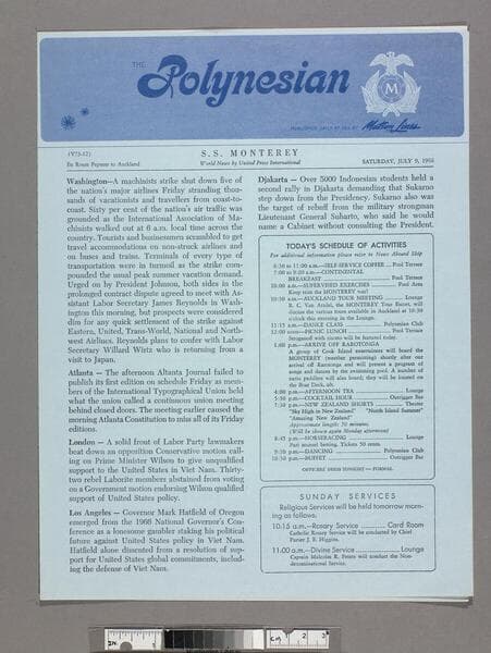 "World news by United Press International"--front cover, below title. Daily onboard newsletter with press releases, list of activities, shipboard news, and arrival information. Focus of item: Monterey.