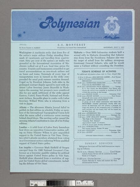 "World news by United Press International"--front cover, below title. Daily onboard newsletter with press releases, list of activities, shipboard news, arrival information, and insert "About Honolulu." Focus of item: Monterey.