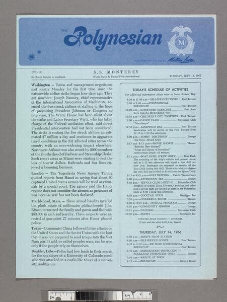 "World news by United Press International"--front cover, below title. Daily onboard newsletter with press releases, list of activities, shipboard news, noon position for previous day, Noumea arrival and port information, and insert "About New Caledonia." Focus of item: Monterey.