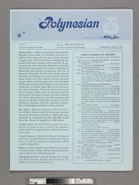 "World news by United Press International"--front cover, below title. Daily onboard newsletter with press releases, list of activities, shipboard news, and passenger regulations. Focus of item: Monterey.