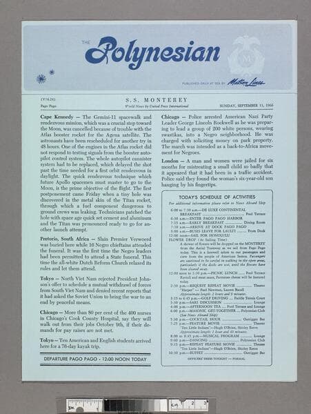 "World news by United Press International"--front cover, below title. Daily onboard newsletter with press releases, list of activities, shipboard news, arrival information, and insert "About Honolulu." Focus of item: Monterey.