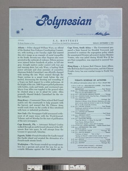 "World news by United Press International"--front cover, below title. Daily onboard newsletter with press releases, list of activities, shipboard news, arrival information, and insert "About Honolulu." Focus of item: Monterey.