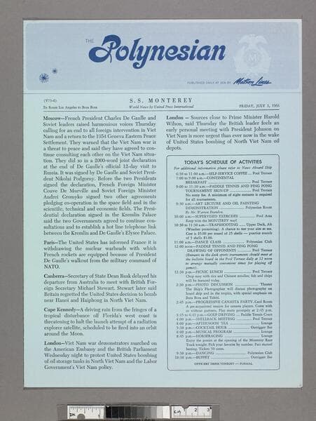 "World news by United Press International"--front cover, below title. Daily onboard newsletter with press releases, list of activities, shipboard news, and noon position for previous day. Focus of item: Monterey.