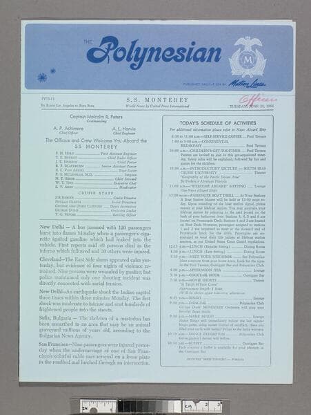 "World news by United Press International"--front cover, below title. Daily onboard newsletter with press releases, list of activities, passenger regulations and two inserts "Let's speak French" and "About Tahiti." Focus of item: Monterey.