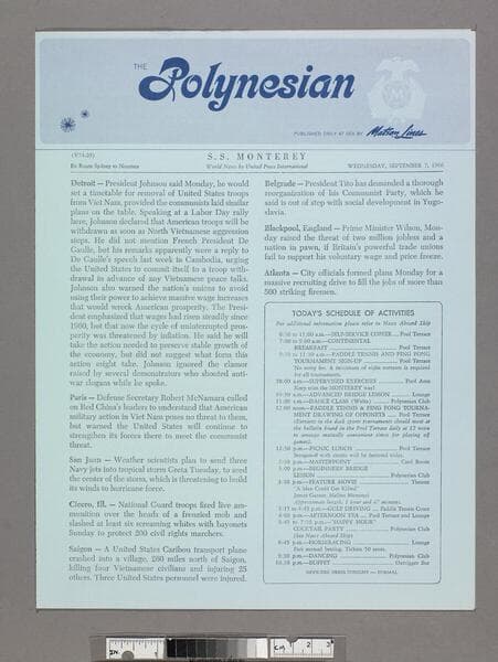 "World news by United Press International"--front cover, below title. Daily onboard newsletter with press releases, list of activities, shipboard news, noon position for the previous day, and arrival information. Focus of item: Monterey.