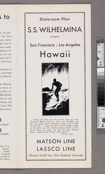 "A-51 (10M WK-7-29)"--front cover, bottom. "The ask Mr. Foster travel information service New Hotel Rosslyn Los Angeles, Cal."--stamped, purple ink, front cover. Deck plans for the SS Wilhelmina with advertising literature. Focus of item: WIlhelmina.