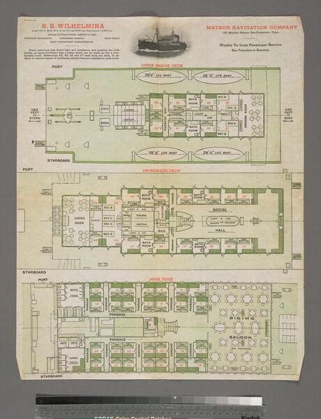 "The Union Lithograph Co., S. F. advertising service"--recto, lower left corner. "Matsonia"--ms. inscription in blue ink, recto, upper right corner. Deck plans for SS Matsonia. Focus of item: Matsonia.