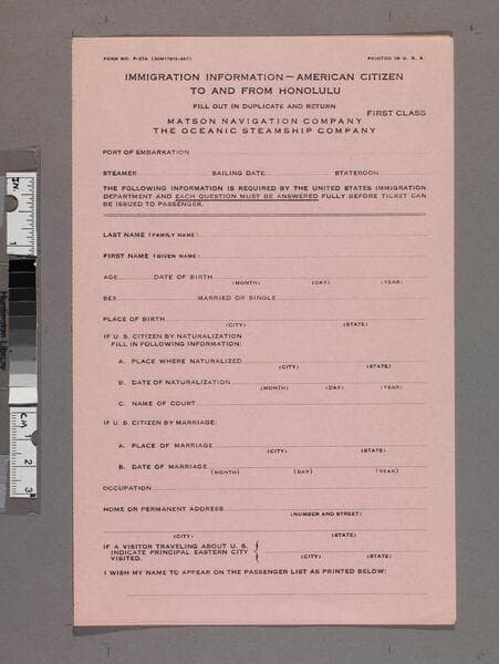 "Form No. P-75 (15M21320-638)" ; "Printed in U. S. A."--recto, upper left. Blank immigration forms printed on pink paper.