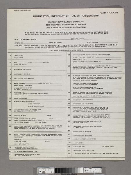 "Form No. 0-43B (3M2787-1231)"--recto, top. Blank immigration form for passengers other than U. S. citizens.