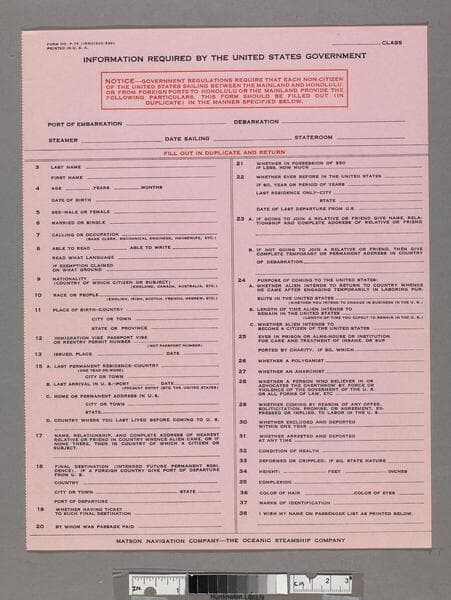 "Form No. P-75 (15M21320-638)" ; "Printed in U. S. A."--recto, upper left. Blank immigration forms printed on pink paper.