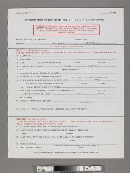 "Form No. 0-43B (3M2787-1231)"--recto, top. Blank immigration form for passengers other than U. S. citizens.