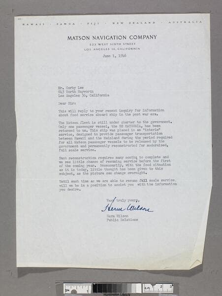 Letter on Matson letterhead