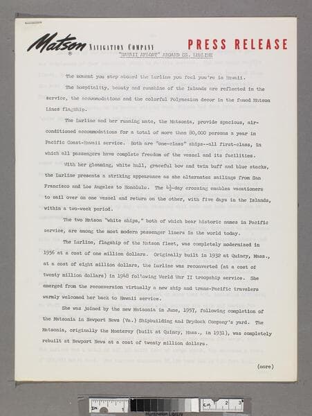 Page count excludes versos. Press release highlighting the facilities and features of the SS Matsonia. Focus of item: Matsonia.