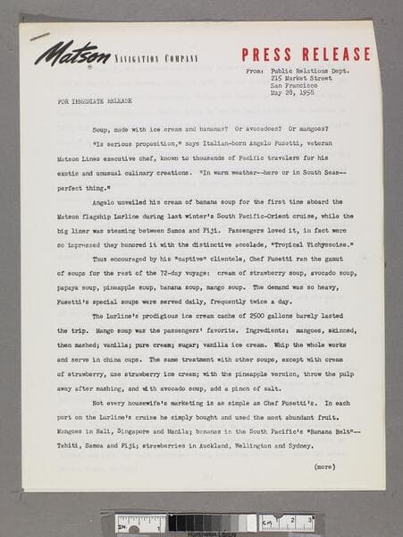 Page count excludes versos. Press release announcing the assignment of Jeronimo Romero as Chef of the SS Matsonia.