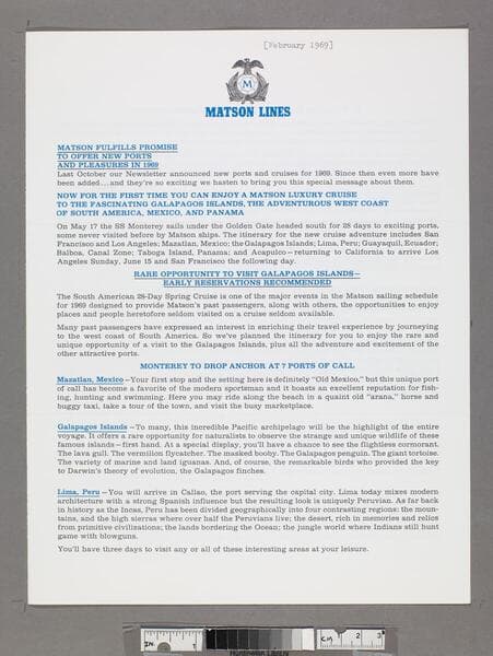 "Litho in U. S. A. lit 234 50M"--back cover, bottom. "Pomona travel agency... Pomona, Calif."--back cover, stamped, blue ink. "MAR 19 1969"--front cover, stamped, blue ink. Advertisement for South America cruise ; including cruise description, ports of call, itinerary, illustrated route map, general information, accommodation descriptions, fares, and RSVP coupon. Focus of item: Monterey.