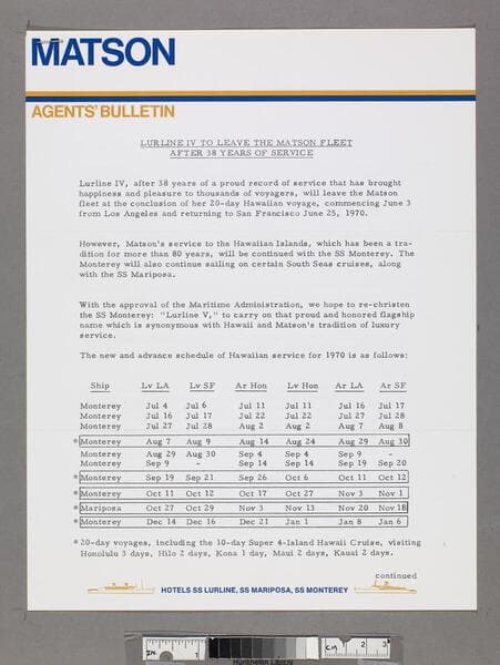 Ms. inscriptions on p [1]. Typed agent's bulletin announcing the presence of Lucille Ball onboard the SS Lurline for filming in June 1970. Focus of item: Lurline.