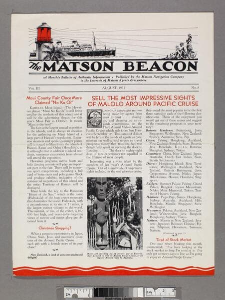 "P-52 Johnck, Kibbee & Co., S. F. 8-5 20M Printed in U. S. A."--back cover, bottom. Sailing schedule and fares for cruises between Hawaii, San Francisco and Seattle; including sailing information, hotel accommodation information, all-expense trip deals, cruise information for Pacific destinations beyond Hawaii, new vessel details, announcement of Royal Hawaiian Hotel opening, and notice for national marketing campaign.