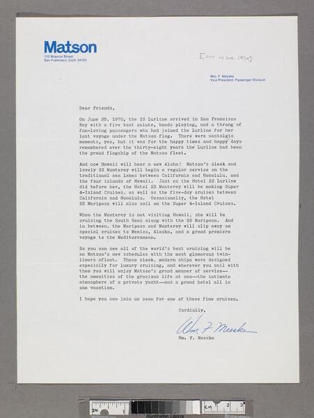 Letter announcing the retirement of the SS Lurline and future cruises for the remaining Matson fleet, advertising leaflets, and a reservation application.
