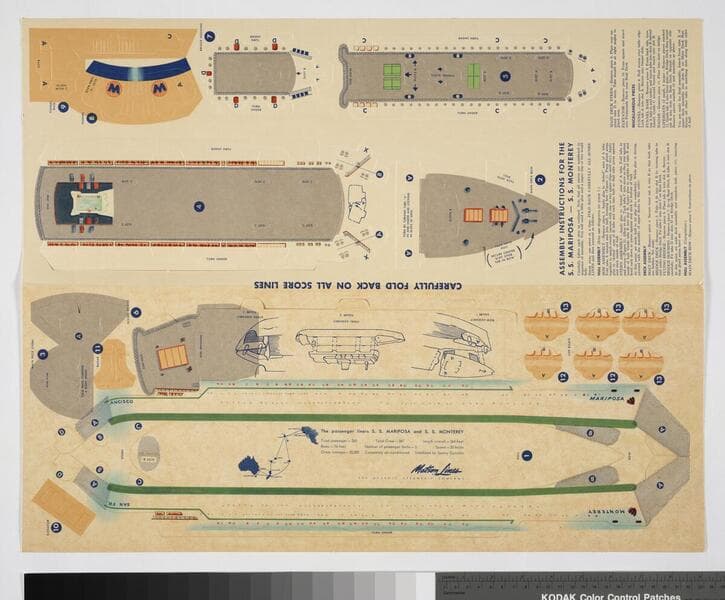 "Lit. 15 Litho in U. S. A. 234567"--back cover, bottom. Room plans and shipboard images of the SS Monterey and SS Mariposa. Focus of item: Mariposa ; Monterey.