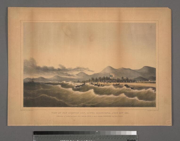 View at San Quentin Bay, Lower California, July 20th 1851 : embarkation of wrecked passengers from steamship UNION, on board steamship NORTHERNER, Capt. Henry Randall