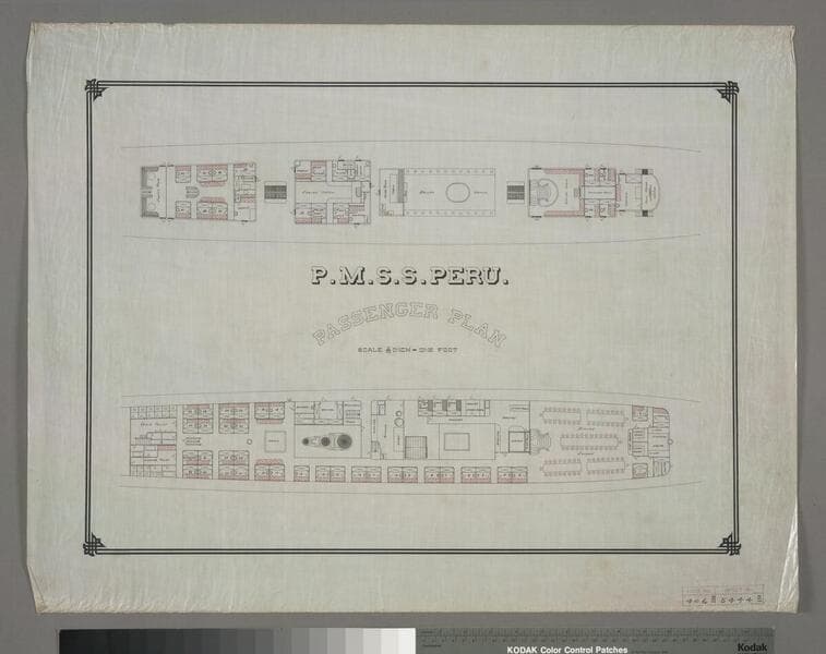 "Arrangement As Built P.M.S.S. Peru, No. 21"--title at top of sheet. The drawing shows two profiles--one a cutaway showing holds and engine spaces--and the six decks of the Peru. In the lower right corner is a case/sheet number, "1464-42150"; original right corner is missing. "1/15" = 1 foot"--scale given. "Peru"--on verso, in ms., in pencil. Unknown as to when the copy was made. The Peru operated for Pacific Mail between 1892 and 1919; built for PMSSCO by Union Iron Works in 1891-92; she was the second Pacific Mail vessel to carry this name. Focus of item: Peru (1892-1919).