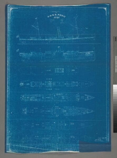 "Proposed re-arrangement of P.M.S.S. Peru : lengthened 50 ft. in way of Fire Room"--title at top of sheet. The drawing shows a profile and the six decks of the Peru . "1/16" = 1 foot"--scale given. In the lower right hand corner is a case/sheet number, "1464-42149." "Peru"--on verso, in ms., in pencil. "Don"--on verso, in ms., in red pencil. Unknown as to when the copy was made. The Peru operated for Pacific Mail between 1892 and 1919; built for PMSSCO by Union Iron Works in 1891-92; she was the second Pacific Mail vessel to carry this name. Focus of item: Peru (1892-1919).