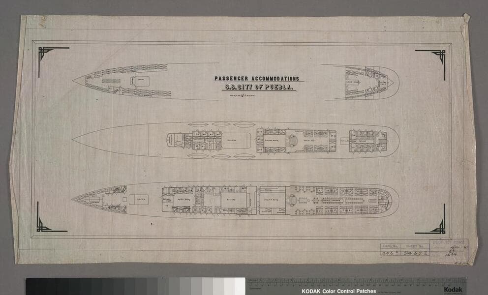 The sheet shows plans for two full decks, not identified, and steerage on the Peru; the deck plans show passenger accommodations, along with the dining saloon, social hall, smoking room and other amenities. Hand drawn on vellum; some color. "P.M.S.S. Peru. Passenger Plan"--title in the center of the drawing. "Scale 3/32 inch = one foot"--scale given. "Case No. 406s Sheet No. 5444s"--purple stamp, lower right corner, numbers in ms., in ink; stamp and the case number are the same as the one found on priJHK 00143, indicating the origin of the drawing is Union Iron Works Co., San Francisco. The Peru operated for Pacific Mail between 1892 and 1919; built for PMSSCO by Union Iron Works in 1891-92; she was the second Pacific Mail vessel to carry this name. Focus of item: Peru (1892-1919).