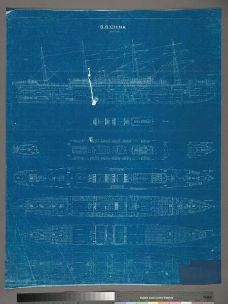 The sheet shows a cutaway starboard profile and five decks of the vessel; the deck plans show passenger accommodations, along with the dining saloon, social hall, card room and other amenities. "P.M.S.S. Peking. General Arrangement"--title at the top of the drawing. "Scale 1/16" = 1 Foot"--scale given. "Case No. 361S Sheet No. 7159S"--lower right corner, stamped on original; numbers, in ms.; stamp and the case number are the similar to the one found on ephKMSP 006, indicating the origin of the drawing is Union Iron Works Co., San Francisco. "E2"--in lower right corner of the image. Unknown as to when the copy was made. "City of Peking"--on verso, in ms., in pencil. The City of Peking, built in 1874, was the first iron-hulled, propeller-driven steamer built for the Pacific Mail Steamship Company; she was chartered in 1898 by US Government as a troopship for Spanish-American War and sailed as part of group led by USS Charleston; laid up at San Francisco in 1908, she was broken up in 1910. Focus of item: City of Peking.