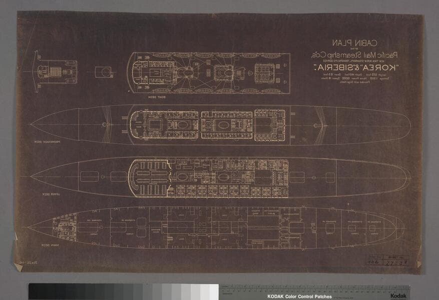 The plans for the decks show passenger accommodations, including steerage,labeled "Asiatic Passengers or Cargo", along with public spaces, such as the dining saloon, social room and smoking room. Measurements for the vessels are printed beneath the title. Key for cabin plan printed below title and vessel measurements. Cabin plan is similar to ephKMSP 048, with slight changes such as "Steerage" to "Asiatic Passengers" and the addition of a key for the staterooms. Once folded, now laid flat. "Pacific Mail S/S Co "Korea"-"Siberia""--on verso, in ms., in pencil. "National Bond"--watermark. Focus of item: Korea ; Siberia.