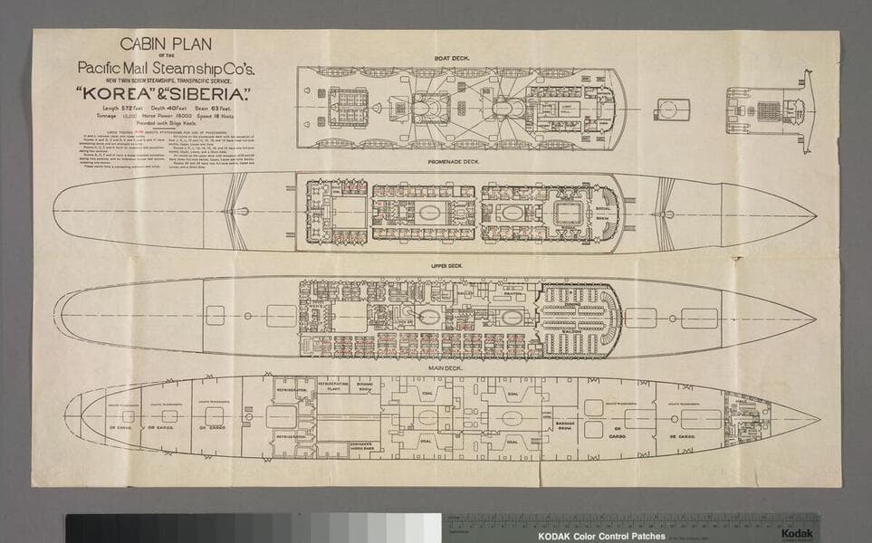The plans for the decks show passenger accommodations, including steerage, along with public spaces, such as the dining saloon, social room and smoking room. Measurements for the vessels are printed beneath the title. Sheet is possibly a transfer paper or an internegative used to make multiple copies. "Case No. 406 Sheet No. 7753s"--stamp, in brown ink, with numbers in ms. in black ink; stamp is not in reverse. "Feb. 26-1906"--lower left corner in reverse. "Johannot et Cie. Annonay Radiant Parchment"--watermark. Focus of item: Korea ; Siberia.
