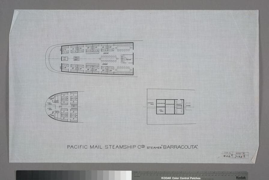 The sheet shows the profile and two decks of the steamship Starbuck; the plans for the decks show passenger accommodations, along with the dining saloon and other amenities. Hand drawn on vellum. "Pacific Mail Steamship Co.'s Steamer Starbuck"--title at top of sheet. No scale given. "Case No. 406s Sheet No. 5442s"--purple stamp, lower right corner, numbers in ms., in ink; stamp and the case number are the same as the one found on ephKMSP 006, indicating the origin of the drawing is Union Iron Works Co., San Francisco. The Starbuck was purchased in 1886 from William H. Starbuck of New York who had salvaged, renamed, and reflagged the vessel in 1885 after she had gone ashore at Moriches, Long Island; Pacific Mail overhauled her engine and hull in 1891; she was lost, without causalities, on February 28, 1899, after striking an uncharted rock off coast of Nicaragua. Focus of item: Starbuck.