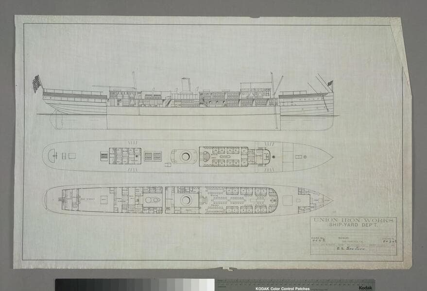 The sheet shows the profile and two decks of the steamship Starbuck; the plans for the decks show passenger accommodations, along with the dining saloon and other amenities. Hand drawn on vellum. "Pacific Mail Steamship Co.'s Steamer Starbuck"--title at top of sheet. No scale given. "Case No. 406s Sheet No. 5442s"--purple stamp, lower right corner, numbers in ms., in ink; stamp and the case number are the same as the one found on ephKMSP 006, indicating the origin of the drawing is Union Iron Works Co., San Francisco. The Starbuck was purchased in 1886 from William H. Starbuck of New York who had salvaged, renamed, and reflagged the vessel in 1885 after she had gone ashore at Moriches, Long Island; Pacific Mail overhauled her engine and hull in 1891; she was lost, without causalities, on February 28, 1899, after striking an uncharted rock off coast of Nicaragua. Focus of item: Starbuck.