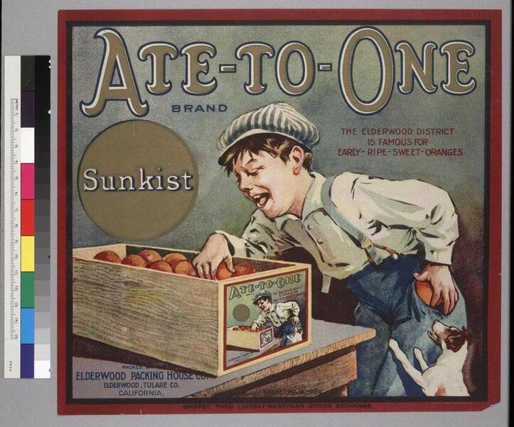 - Image of a boy with a terrier dog reaching into a wooden crate of oranges on a table; double of the label being described on the crate.