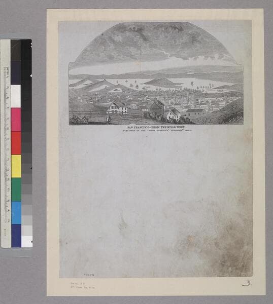 Image is of the general view from Nob Hill area looking east with Yerba Buena Island in the background. Two figures are standing on the hill in the foreground and an artist is sketching. Baird notes that although this image is apparently not the same stone, it is the same basic view as "San Francisco Upper California." "[Britton] & Rey Cor. Montgy. & Comml. Sts."--text, below image. "Noisy Carrier's Publishng [Hall]. 77 Long Wharf San Francisco. Charles P. Kimball Propretor [sic]."--stamped text, below image to the right. Paper color: gray.