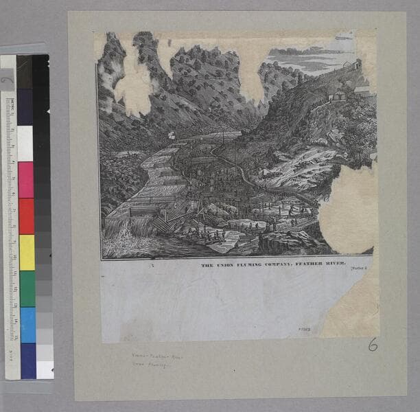 View of flume, showing details, with tents in background in a canyon. Handwriting inside case, under plate, reads: "Louisiana Company's Flume on the Mokelumne River. Taken Oct. 1853. View of upper part of [__?] and all of the [Ramsbottom?] and a part of the [Minters? Bank?]." A list of names follows: "Capt. Birdsall, Boston; Capt. Bunker, Lowell; Demithy Reid, S.C.; Horatio Reynolds; H. E. Chesebrough & [Mathew?] Lightman; Luke Chesebrough; G. Shannon; Tom Thompson; Lorna; Shorb [C?] & Bell." In addition, another note inside the case reads: "Chesebrough's Flume, Maquilumne [sic] River, Calaveras Co. Cal. 1852, 1853 & 1854."