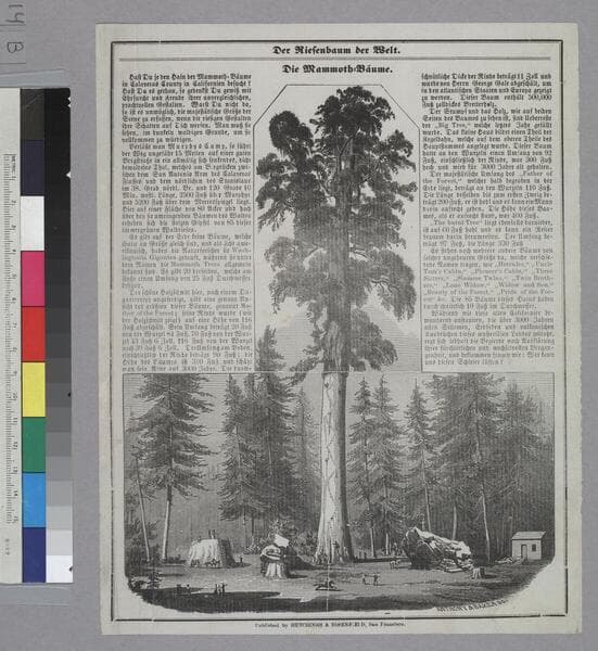 Image is of a giant redwood tree in the center with lesser tress in the background. There are several people standing in the foreground and some people are standing on a large redwood stump. The text on either side of the image describes Mammoth Tree Grove of Calaveras County. Baird notes that this image is closely related to Hutchings' issue (Baird #106). "Fishbourne's Lithog. Entered according to Act of Congress in the year 1855, by D. A. Plecker, in the Clerks' Office of the U. S. District Court for the Northern District of California. Ohio St. San Francisco."--text, below image. Paper color: buff.