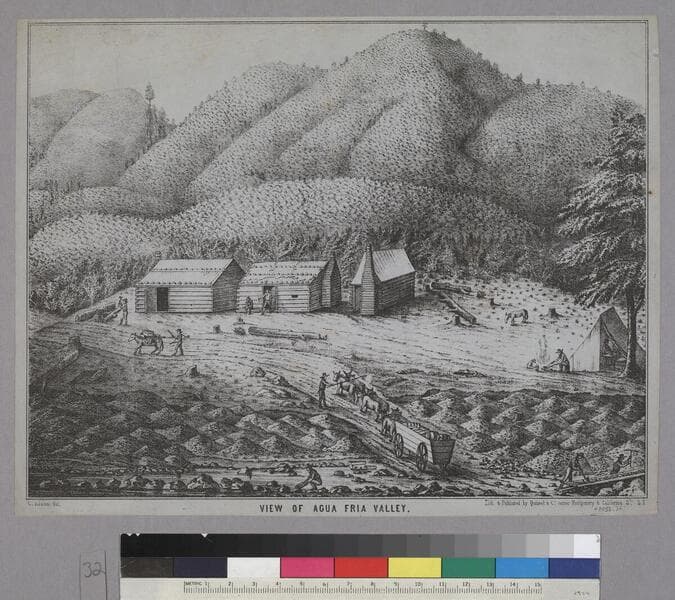 Image of a village nestled in a ravine. There are several oxen-drawn carts and horsemen in the foreground and sparse tall trees on the low hills in the background. "Lith. & Published by Quirot & Co. corner Montgomery & California Sts. S. Francisco."--text, below image. Paper color: gray.