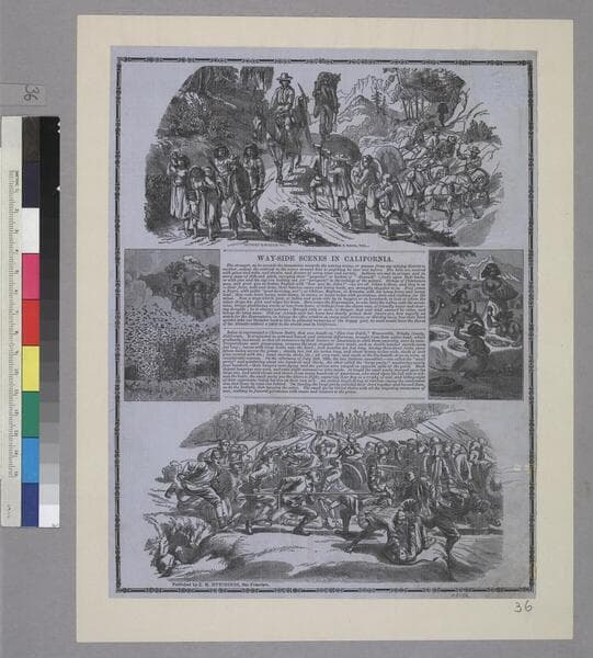 Image contains four vignettes. The top vignette depicts men marching through a forest to the mines with mules. The center left vignette depicts miners plodding up a hill. The center right vignette depicts one man being lowered into a vertical shaft with a windlass while two other men stand nearby. The bottom vignette depicts men sitting around a campfire at night in the forest. "Lith. & Pub. by Britton & Rey, San Francisco."--text, below image. The number 24 is in the upper right corner indicating that this image may be part of a series. Paper color: buff.