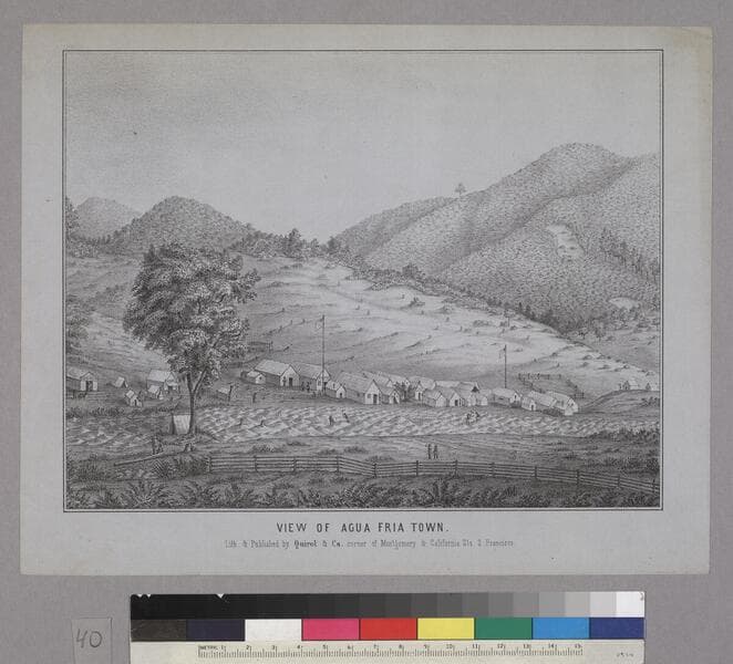 Image of a village nestled in a ravine. There are several oxen-drawn carts and horsemen in the foreground and sparse tall trees on the low hills in the background. "Lith. & Published by Quirot & Co. corner Montgomery & California Sts. S. Francisco."--text, below image. Paper color: gray.