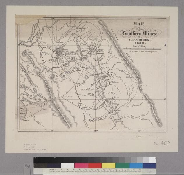 Image is of a map from Jackson, Mokelumne Hill, and Cosumnes River in the north to Ft. Washington and Lost Mt. in the south, and from the Bay of Monterey in the east to Sierra Nevada in the west. "Lith. & Published by Quirot & Co. corner Montgomery & California Sts. S.F."--text, below image. "Noisy Carrier's Publishing Hall."--stamped text, below image. Paper color: blue.