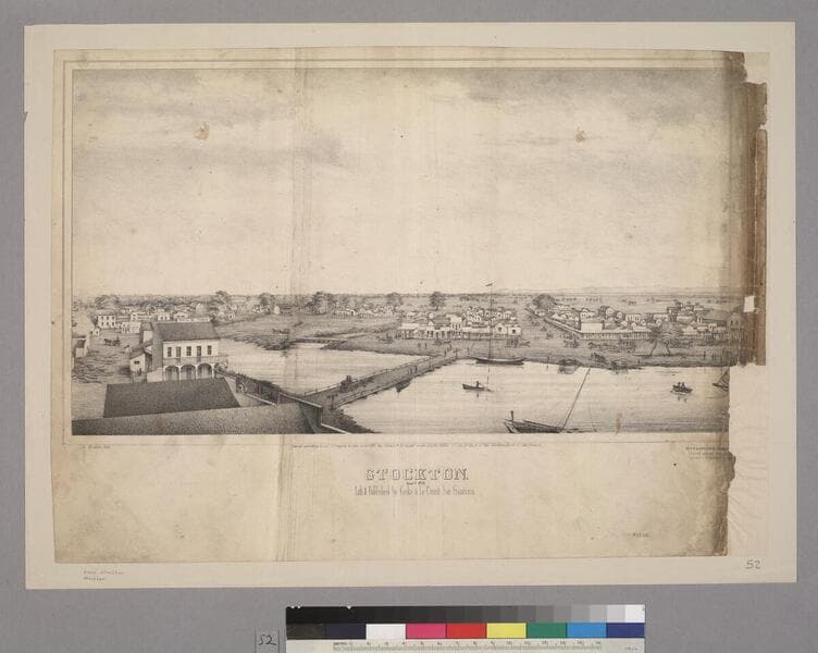 Image is of the town with buildings on the river's right side and two bridges at or near the forks of the river. There are tall pines at left, and hills in the background. "Sketched by Mrs. M.N. Horton. Entered according to act of Congress in the year 1852 by Cooke & Le Count in the clerks Office of the Dt. Court of the Northern Dist. of California. Lith. of Cooke & Le Count S. Francisco. Published by Cooke & Le Count, Stationers Warehouse."--text, below image. "Noisy Carriers Publishing [Hall]. 77 Long Wharf San Francisco. Charles P. Kimball Propretor [sic]."--stamped text, below image to the left. Paper color: gray.