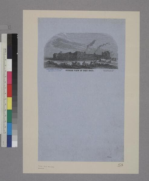 Image is of two raised structures in the back and long low buildings on the left and right seen from the interior of the fort. There are several persons in the yard. This image is one of a pair of views of Fort Hall. "Published at the Union Office."--text, below image. "Noisy Carrier's Publishing Hall. Long Wharf San Francisco."--stamped text, below image to the left. Paper color: buff.