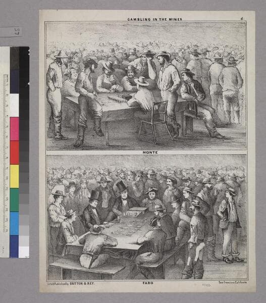 Upper image is of the interior of a bar. Two men are playing cards at a table while a third looks on and a bartender serves two others. Lower image is a view of mining works in a wooded hilly region. Four men work with pick and shovels, and one with a pan. "Lith. & Published by Britton & Rey S. Fo."--text, below image. The number 10 is in the upper right corner, indicating that this image may be part of a series. Paper color: buff.