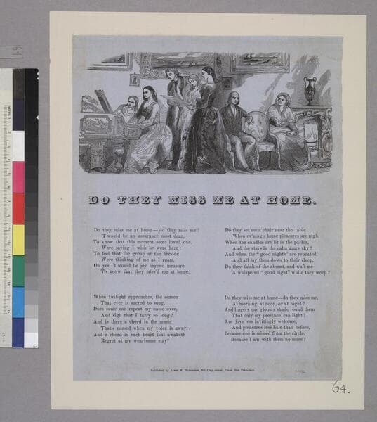 The upper left vignette depicts a man writing at a table with a woman standing nearby urging him to write. The upper right vignette depicts a man and wife seated in a dining room with four children playing. In the center of the sheet is the list of commandments for California wives. To the left of the commandments is an image of a man sitting outside a tent, and to the right is a woman with three children playing. "C.C. Kuchel del. W.C. Butler S.F. Mercantile Job Print, 130 Sansome St., S.F."--text, within upper vignettes. "W.C. Butler S.F. [Entered acco]rding to act of Congress, in the year 1855, by James M. Hutchings, in the Clerk's office of the U.S. District Court for California. Address J.F. Larrabee, San Francisco."--text, below image. Paper color: blue.