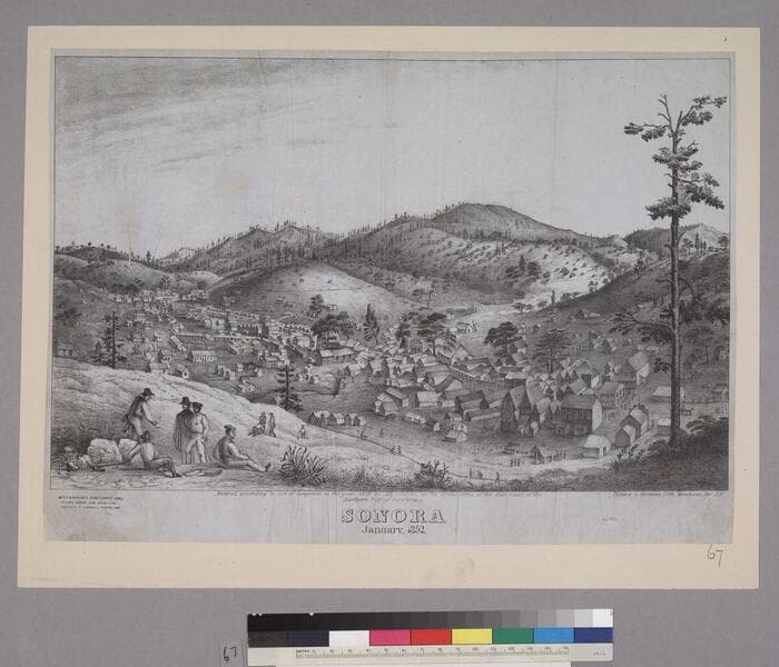 Image is of the view of the town from a nearby hill. The main street runs more or less diagonally across the scene. There are scattered building beyond the main street and hills in the background. There are two men in the lower left foreground. Baird notes that it is quite different from "Sonora January 1852." "George H. Goddard del. Lith. by Britton & Rey San Francisco."--text, below image. Paper color: gray.