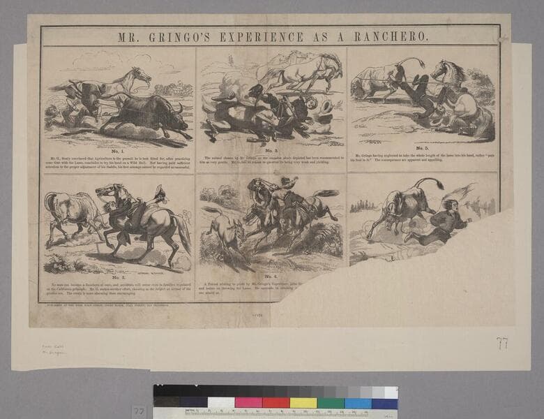 Image contains a series of six vignettes depicting the attempts and failures of "Mr. Gringo" to become a ranchero. He is seen struggling with his horse and lasso in many of the vignettes. It appears that this image has been cut from its original sheet because it is missing its border, title, and publishing information. Paper color: buff.