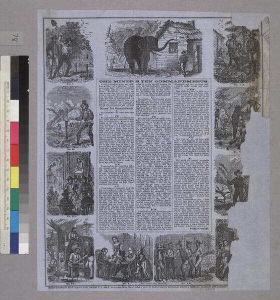 Image of eleven vignettes depicting The Miners' Ten Commandments and an elephant pointing with its trunk to a sign for Ten Commandment [sic] on a cabin. The commandments deal with mining practices, moral issues, and family matters. The vignettes surround the text at the center of the image which describes the commandments. "H. Eastman del."--text, below the first vignette. "Eastman. [Anthony & Baker]."--text, below tenth vignette. "Sun Print, San Francisco. Entered according to Act of Congress, in the year 1853, by James M. Hutchings, in the Clerk's Office of the U.S. District Court for the Northern District of California. Orders, pre paid, addressed "[Box H Placerville, El Dorado Co., Cal."]."--text, below image. Part of the right side of the image has been torn away on the right side. Paper color: blue.