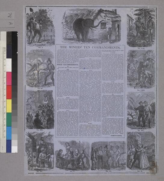 Image of eleven vignettes depicting The Miners' Ten Commandments and an elephant pointing with its trunk to a sign for Ten Commandment [sic] on a cabin. The commandments deal with mining practices, moral issues, and family matters. The vignettes surround the text at the center of the image which describes the commandments. "H. Eastman del."--text, below the first vignette. "Eastman. [Anthony & Baker]."--text, below tenth vignette. "Sun Print, San Francisco. Entered according to Act of Congress, in the year 1853, by James M. Hutchings, in the Clerk's Office of the U.S. District Court for the Northern District of California. Orders, pre paid, addressed "[Box H Placerville, El Dorado Co., Cal."]."--text, below image. Part of the right side of the image has been torn away on the right side. Paper color: blue.