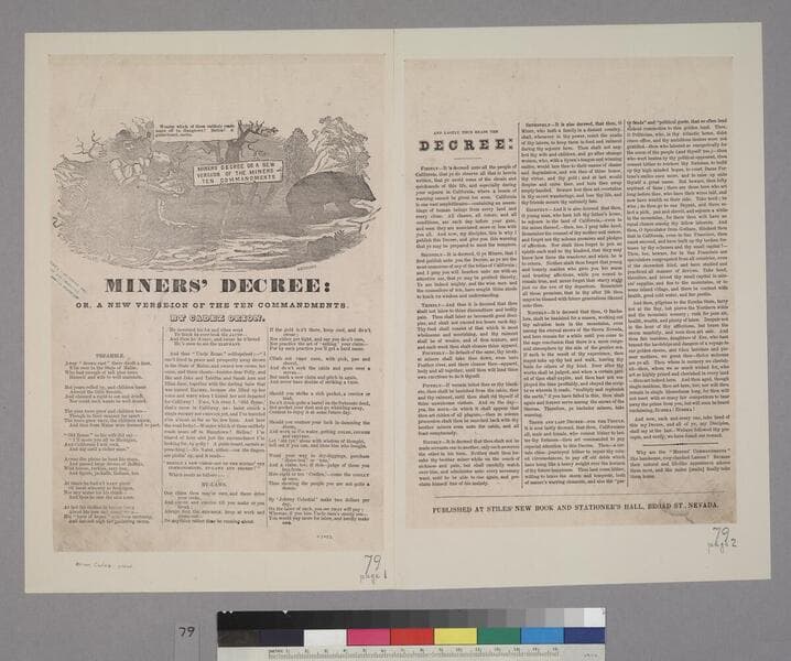 Image of eleven vignettes depicting The Miners' Ten Commandments and an elephant pointing with its trunk to a sign for Ten Commandment [sic] on a cabin. The commandments deal with mining practices, moral issues, and family matters. The vignettes surround the text at the center of the image which describes the commandments. "H. Eastman del."--text, below the first vignette. "Eastman. [Anthony & Baker]."--text, below tenth vignette. "Sun Print, San Francisco. Entered according to Act of Congress, in the year 1853, by James M. Hutchings, in the Clerk's Office of the U.S. District Court for the Northern District of California. Orders, pre paid, addressed "[Box H Placerville, El Dorado Co., Cal."]."--text, below image. Part of the right side of the image has been torn away on the right side. Paper color: blue.