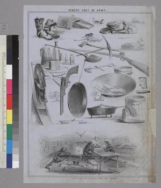 Upper illustration is of an elephant lifting its trunk to point at a paper on a tree that says: "Miners [sic] Ten Commandment [sic]. A miner is also looking at the sign. Baird notes that this illustration is related to the top central vignette of "Hutchings Miners' Ten Commandments." The text printed below the illustration outlines the ten commandments. Baird notes that the text is also related to "Hutchings Miners' Ten Commandments," but Commandment VI is abbreviated and Commandment X is rephrased and abbreviated. "Published at "Noisy Carrier's," 77 Long Wharf, San Francisco, Cal."--text, below image title. "Potter. HE. Anthony."--block letters within image. "O'Meara & Painter, printers, San Francisco."--text, below image. Paper color: blue.